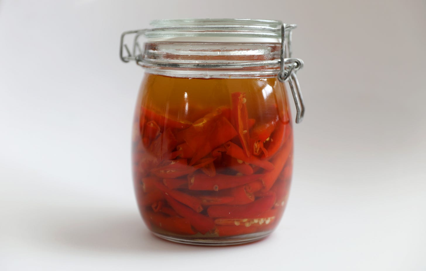 Heat some olive oil—about half the volume of your jar—until it reaches 350˚F (175˚C), just below the smoke point. Then VERY SLOWLY AND CAREFULLY, using a metal canning funnel, pour the hot oil into the jar. The peppers will sputter and begin to fry. Pour in enough oil to cover them by at least 1/2 an inch (1 cm) and let the jar sit until it’s cool enough to touch. Put a lid on it and move it to the fridge, where it will keep for a good long time as long as you make sure the peppers are always fully covered by oil.