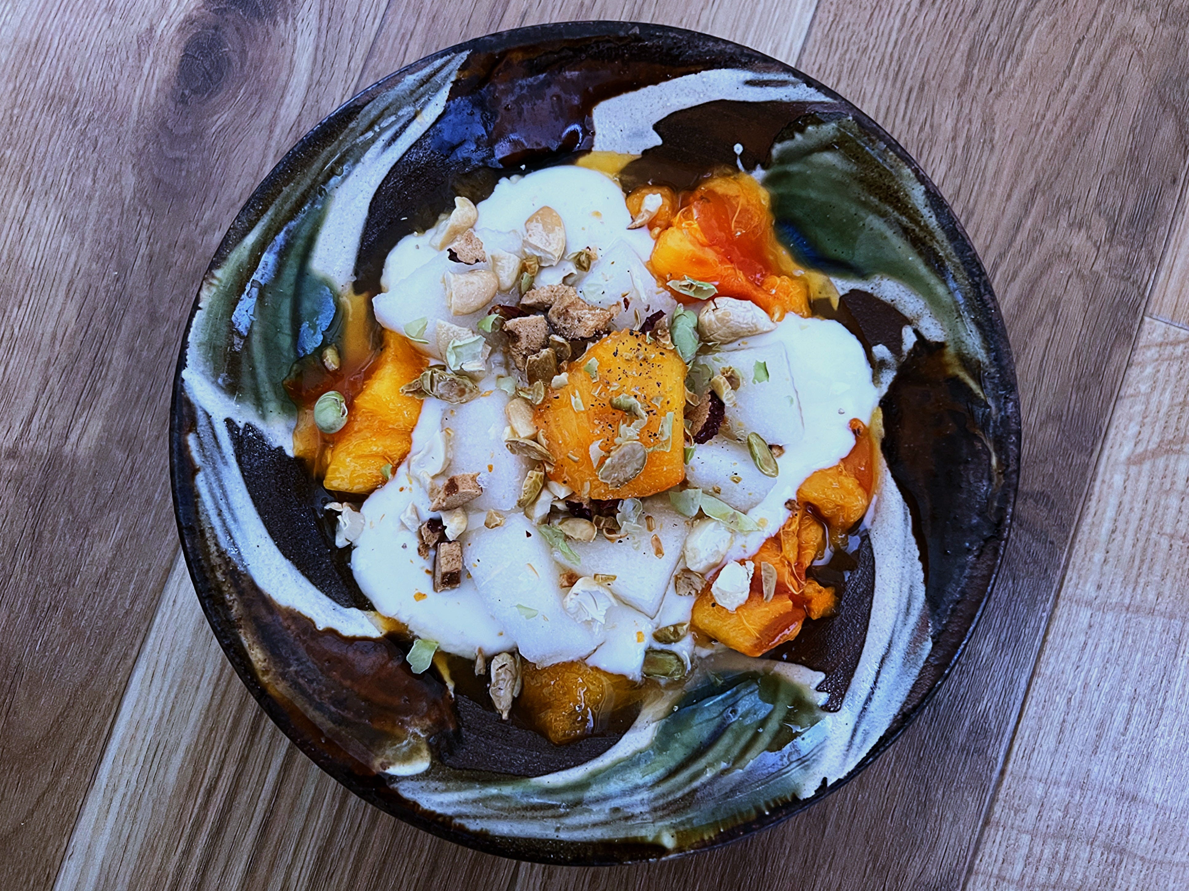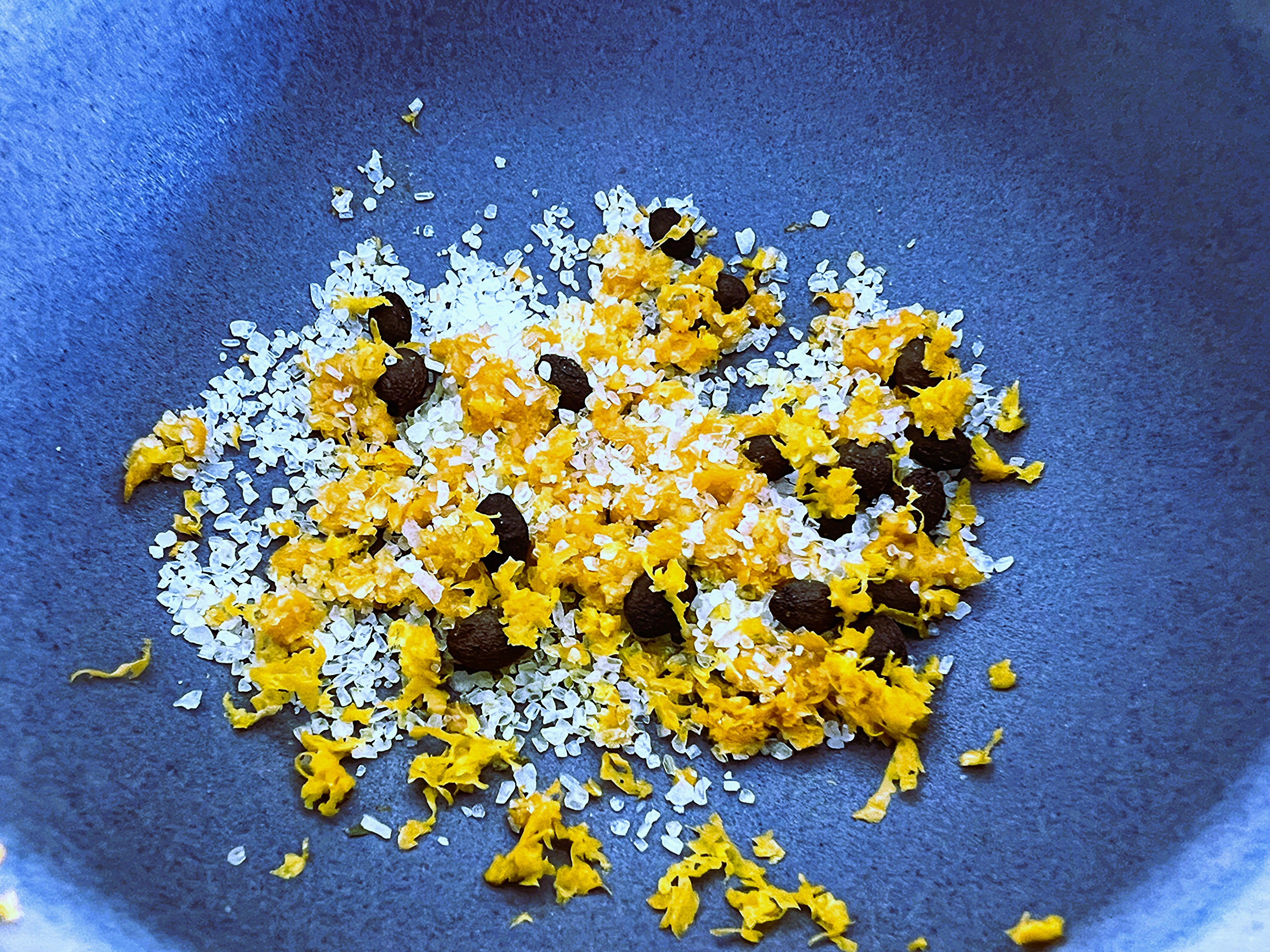 In the images throughout this post, I step through using the zest of two mandarin oranges ground with one tablespoon of coarse sea salt and a teaspoon of whole spicebush berries I foraged and dried this season. The final ground mix will be slightly moist but separates when you rub it between your fingers, which makes it just right for finishing applications. It’s absolutely delicious sprinkled on the most ripe end of the season persimmons in a yogurt bowl.